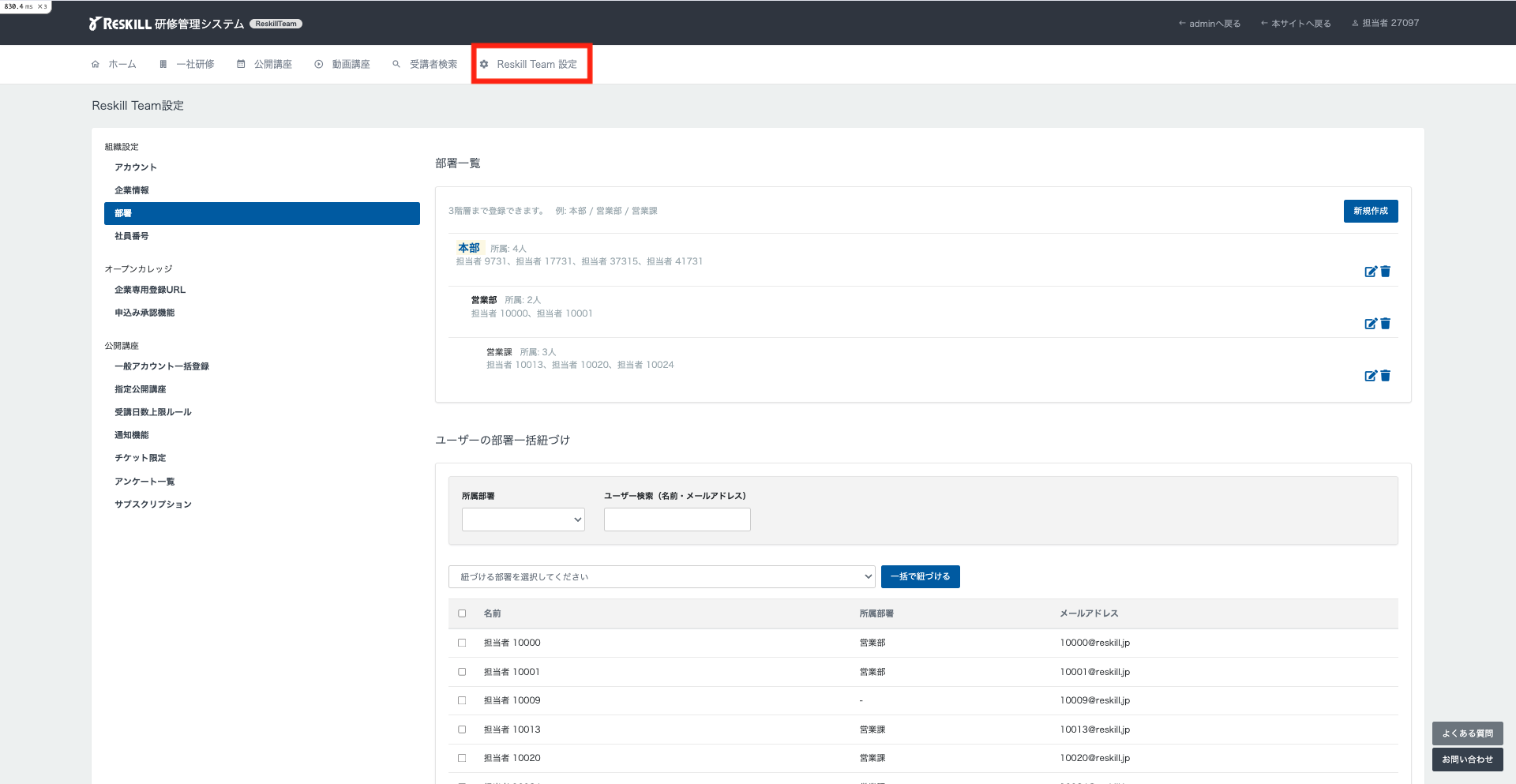 ① Reskill Team設定画面で部署を作成してください